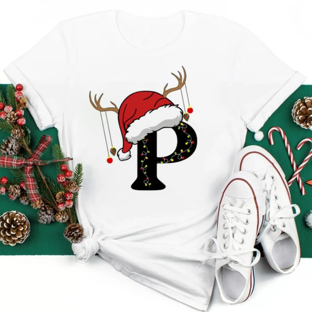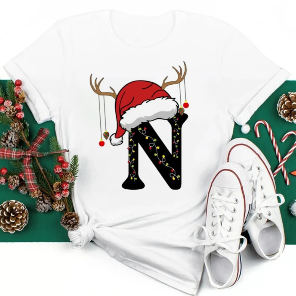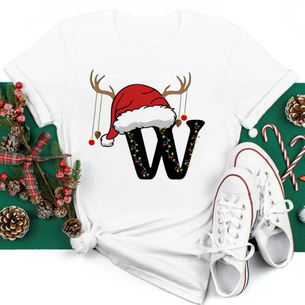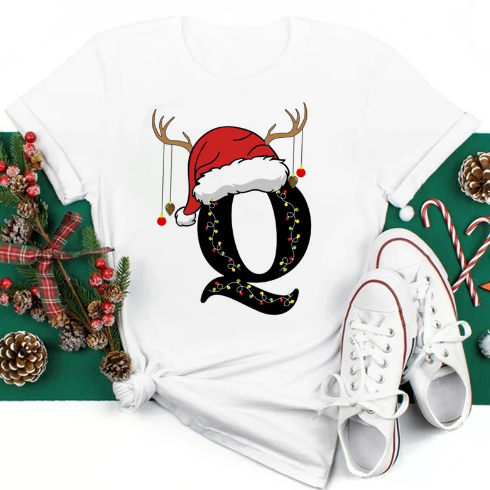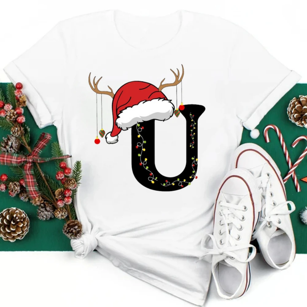 Christmas Hat A To Z Letters Oversize Tshirt Christmas Family Gathering Activity Short-sleeved Shirt Oversize Streetwear Fashion